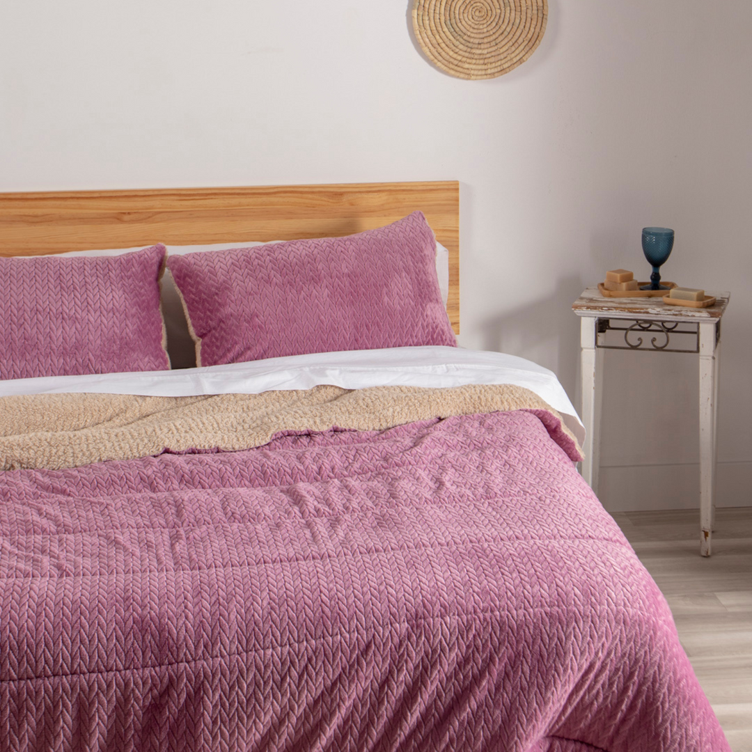 Disfruta del máximo confort térmico con este edredón de invierno con diseño estampado. Confeccionado con una cara superior de franela suave y un reverso de tejido sherpa (borreguito), ofrece una calidez inigualable. Está acolchado con un relleno de 150 g/m² de fibra hueca de poliéster. Su tejido es muy suave y agradable al tacto, proporcionando una sensación de confort y abrigo perfecta para combatir el frío.